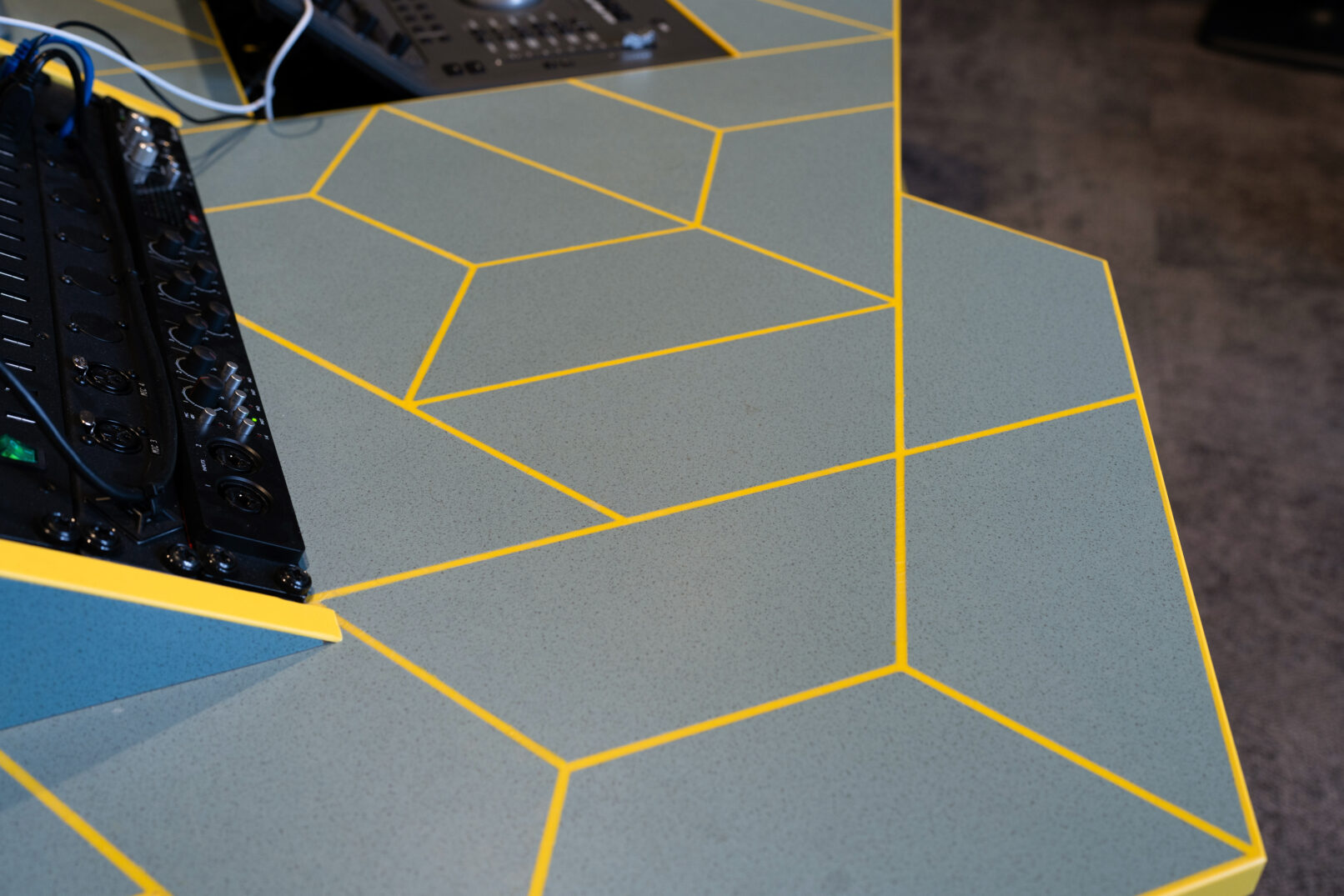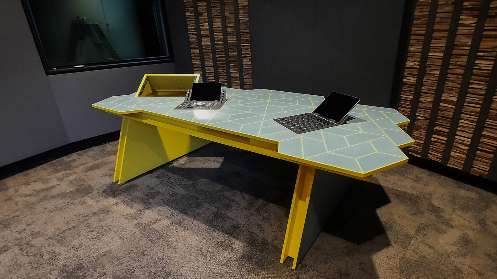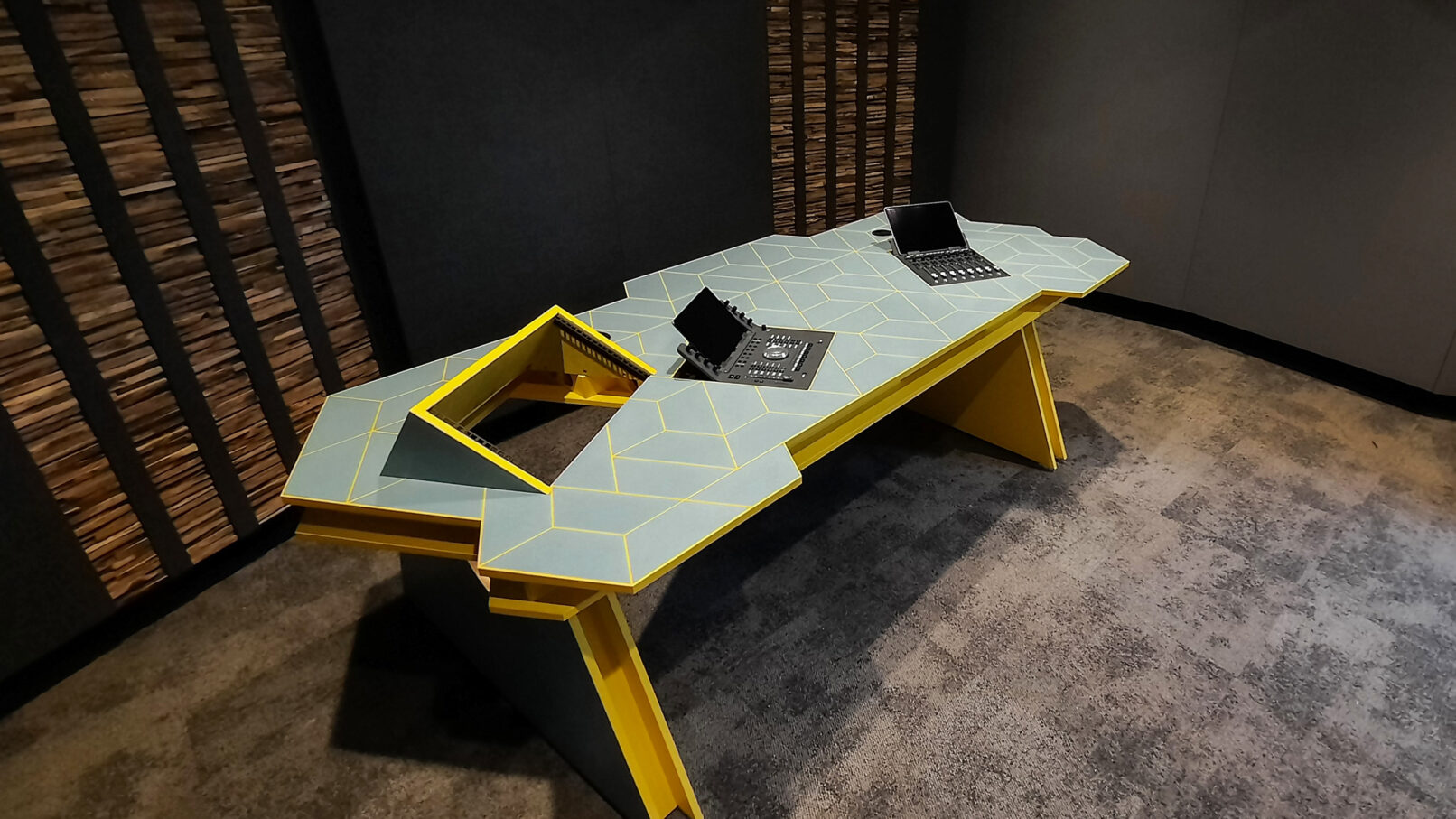 De naden hebben we een levendige gele kleur gegeven, wat het geheel een gedurfde, moderne uitstraling geeft. Het resultaat is een desk die doet denken aan een gigantische printplaat—een mooie mix tussen kunst en technologie. Dankzij de ingebouwde techniek biedt deze desk een inspirerende werkplek die de creativiteit van studenten prikkelt.