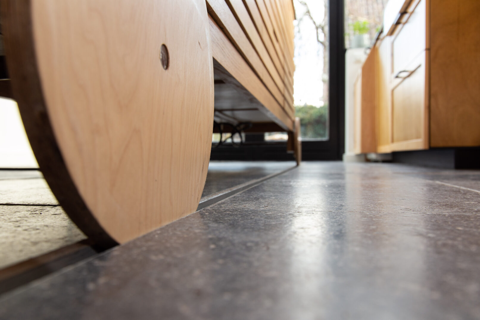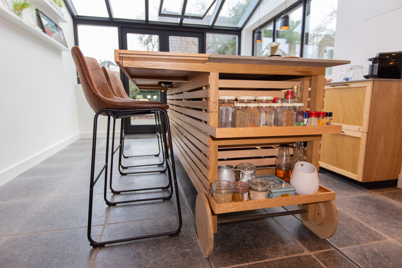 Deze twee elementen verbinden we door een kookeiland in het midden, het hart van de ruimte, waar je met zijn alle kunt zitten terwijl er wordt gekookt. Om ruimte te geven, staat het eiland op wielen en kan, in een rails, van de ene naar de andere kant van de keuken rijden.
